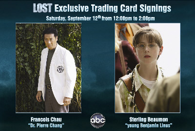 Sterling Beaumon who plays the young Benjamin Linus was one of the signers who could be met at the event. If wished Sterling personalized the card so you can guess there exist hundrets of variants of this card. My signed card (shown above this article on the right side) is without dedication. These cards are very hard to find and extremely pricy when seen on eBay. |